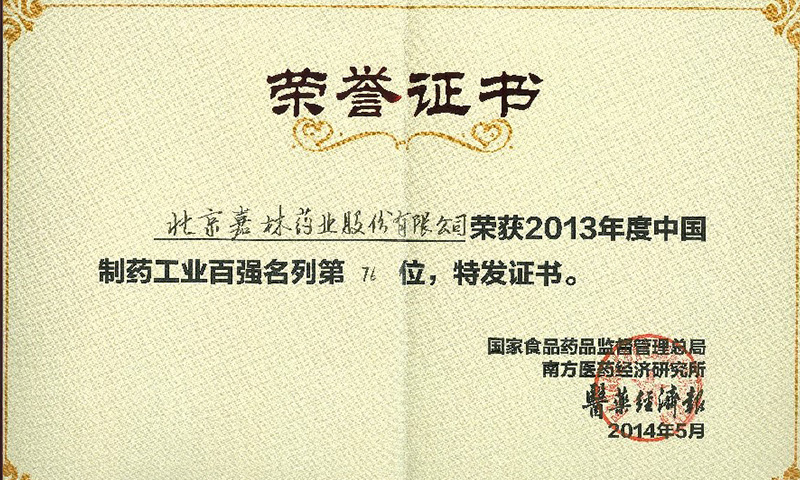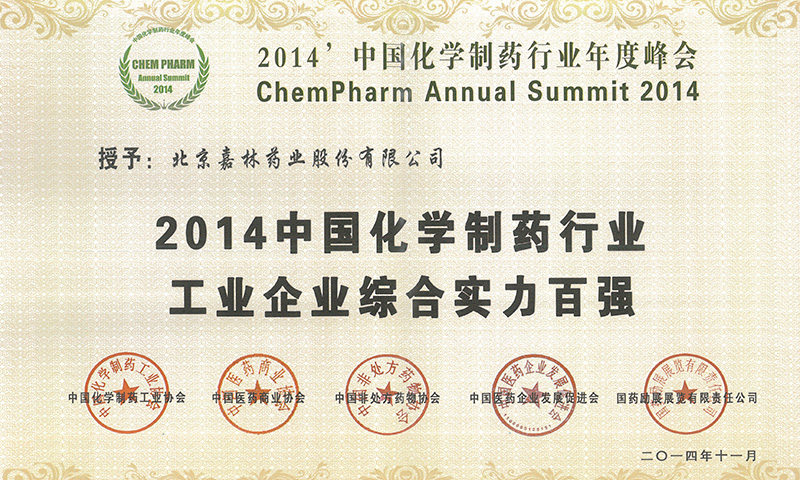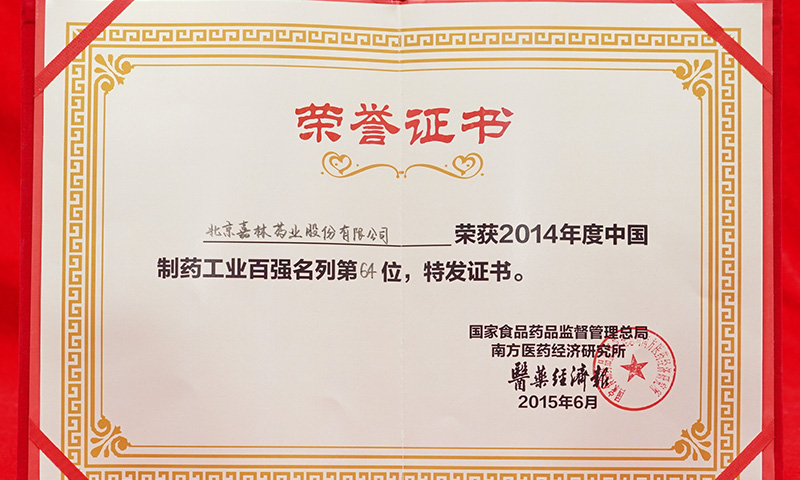 • 2014年度中國制藥工業(yè)百強名列第64位