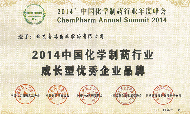 • 2014中國化學制藥行業(yè)成長型優(yōu)秀企業(yè)品牌?