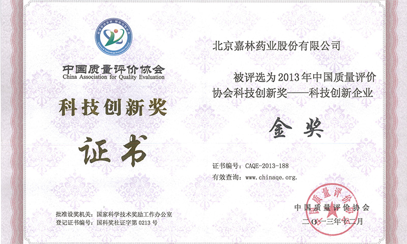 • 2013年中國質(zhì)量評價協(xié)會“科技創(chuàng)新企業(yè)金獎”