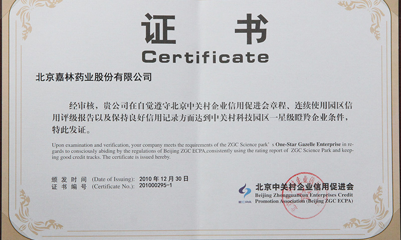 • 中關(guān)村科技園區(qū)一星級瞪羚企業(yè)證書